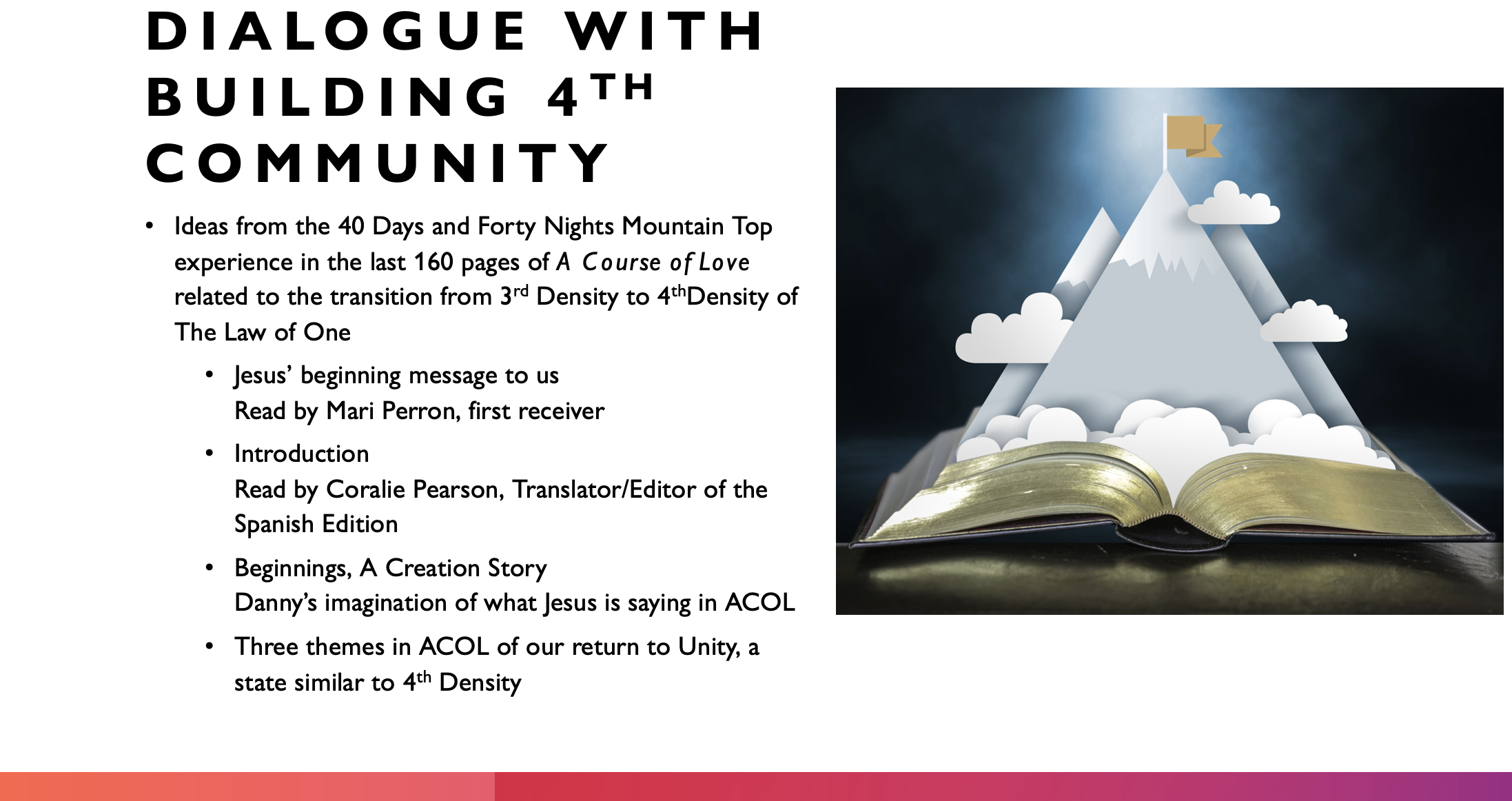 Building 4th member, Danny Neece, gave a wonderful introduction to A Course of Love material. This channeled material has been instrumental to him and to many others in learning how to live out our daily lives with wholeheartedness. Mari Perron, the one who received ACOL, was also present in the online gathering. Some discussion included similarities between the Law of One material and A Course of Love.