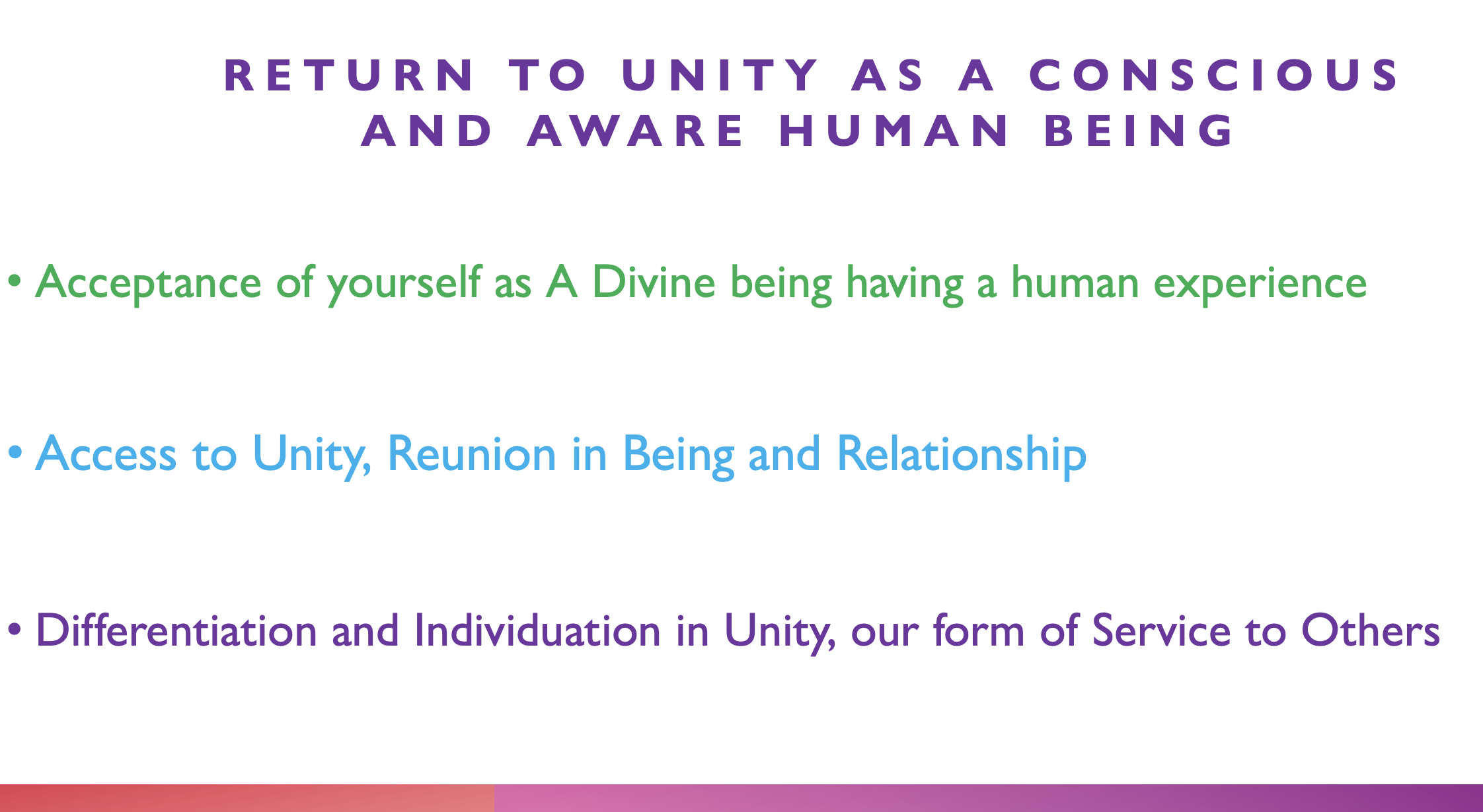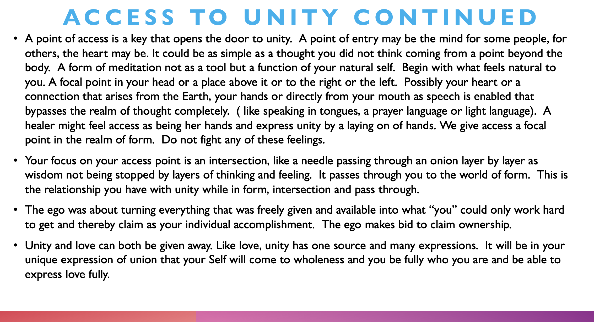 •Unity is a place that is your natural state, free from suffering, free from learning, free from death. Access then is the key to this treasure. Access is through establishing your identity, you are a being existing in union. The basic truth is you are a being who exists in unity rather than separation. This is the first step to the access that you seek, within you is the Kingdom of Heaven.