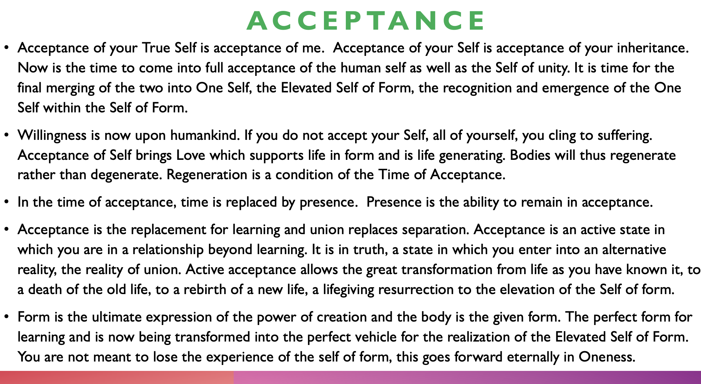 •Acceptance of your True Self is acceptance of me. Acceptance of your Self is acceptance of your inheritance. Now is the time to come into full acceptance of the human self as well as the Self of unity. It is time for the final merging of the two into One Self, the Elevated Self of Form, the recognition and emergence of the One Self within the Self of Form.